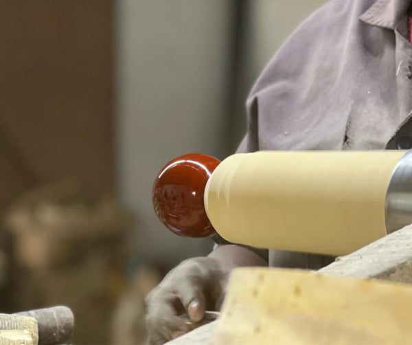 A stick of coloured lacquer is rubbed against the revolving wooden form. Lacquer transfers to the wood due to friction and heat produced by it. The coating is then finished with dried palm leaves. Oil secreting from the palm leaf mixes with the lacquer, giving it a smooth, shiny